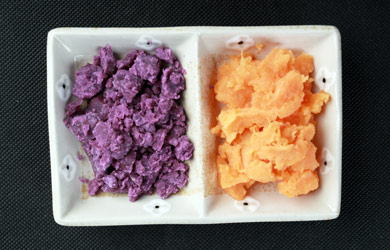 將熟透的紅薯和紫薯去皮、切大塊,放入攪拌機,打成番薯泥,如果沒有攪拌機可以選擇用湯匙按壓成泥,想要口感更加可以在番薯泥裡面添加少量的黃油,餡料口感更佳。
