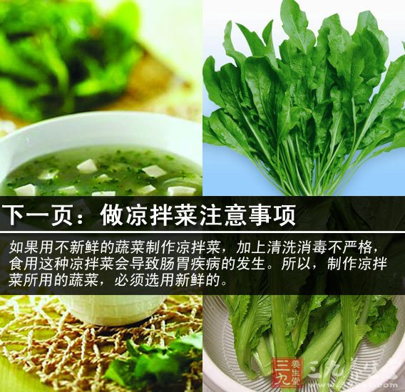 如果用不新鮮的蔬菜制作涼拌菜,加上清洗消毒不嚴格,食用這種涼拌菜會導致腸胃疾病的發生。所以,制作涼拌菜所用的蔬菜,必須選用新鮮的,制作時也必須沖洗干淨,最好用開水燙一下,也可用洗滌劑等泡後沖淨。這樣一來,大大減少了附在蔬菜上的細菌和寄生蟲卵。同時,用熟食品做涼菜時,應重新加熱蒸煮,適當加入蒜、醋、蔥等做配料,不但味美可口,而且能起一定的殺菌作用。