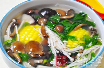 1:玉米洗淨切段, 菇類淡鹽水浸泡片刻,清水沖洗干淨, 芹菜葉洗淨
