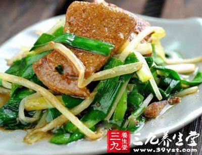 制作:洗淨豬肝的血液,切成5毫米薄片,先下鍋煮至七成熟,然後與新鮮韭菜、洋蔥同炒,並調好味。