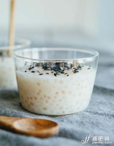 1、在杏仁牛奶裡浸泡西米4小時以上,中火煮沸後加入椰奶、糖漿。