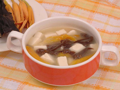 做法:先將黑木耳泡發後洗淨,豆腐切成片;將豆腐與黑木耳加入雞湯及鹽同炖10分鐘,即可食用。