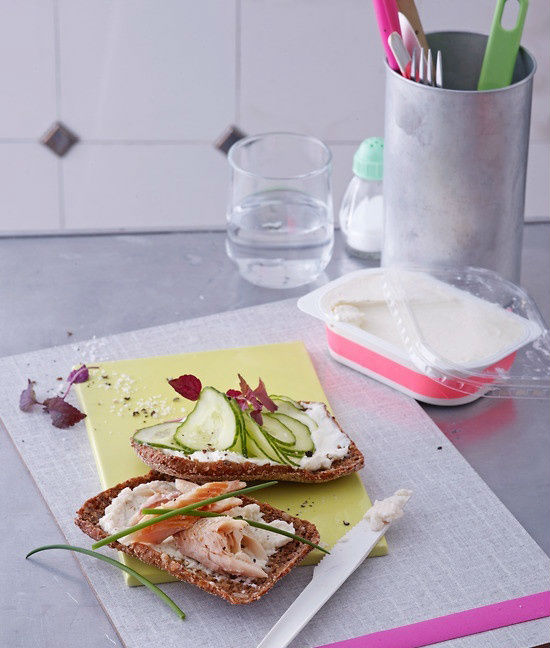 雞蛋打在杯子裡,兩塊小圓面包配乳酪奶油與雜蔬