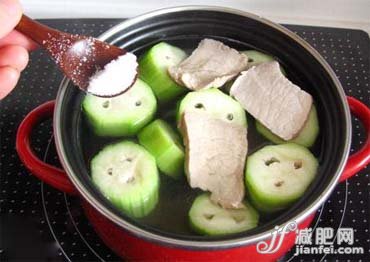 用料:瘦豬肉50克,絲瓜25克,精鹽、味精、清湯各少許。