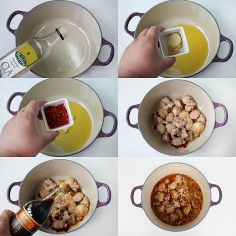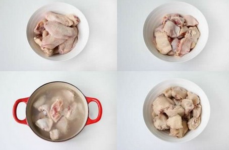 1.雞翅或者雞腿洗干淨,剁成小塊後過沸水去除血水與雜質備用。