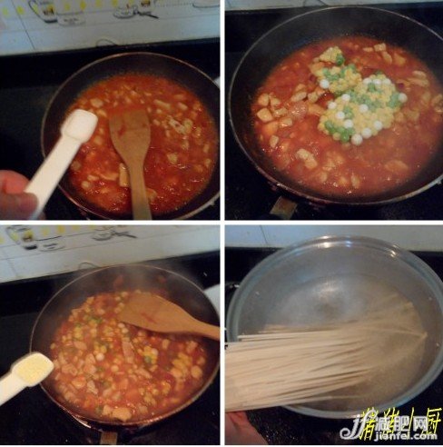 10 放入玉米和豌豆11 放入雞精改成小火,熬至醬汁邊的粘稠