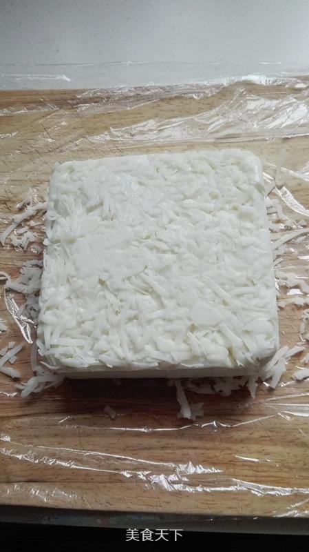11案板上鋪保鮮膜,撒上適量的椰絲,牛奶倒扣在椰絲上,用利刀切成小塊,沾上適量的椰絲,裝盤即可;