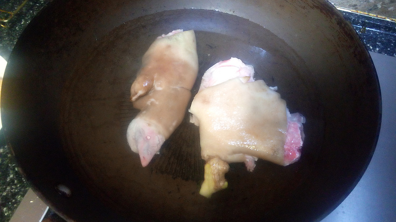 1豬蹄洗淨,冷水下鍋,放料酒、拍過的姜塊一起焯水,(豬蹄的骨頭已砍小,只是皮還連著,讓賣豬肉的大叔幫弄的)