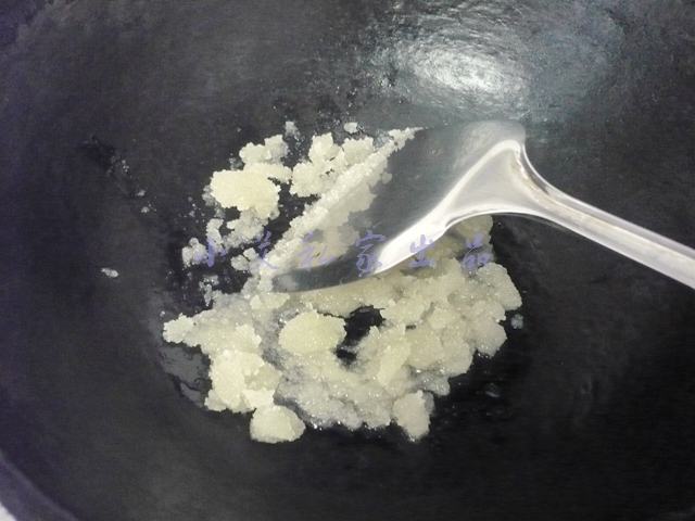 4炒鍋中放底油。放入4大勺白砂糖,用小火慢慢熬制。
