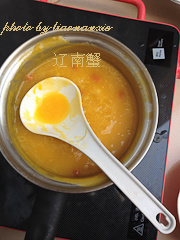 99、將雞湯同蒸好的南瓜回鍋。進行二次調味,這裡可以加鹽和一點點兒耗油,盡量避免用有色調料。我用了鹽和一點兒糖。