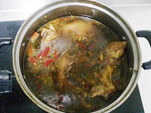 5放入豬蹄,大火煮開轉中火,鹵差不多1個小時左右(皮用筷子扎可以輕松扎穿)。