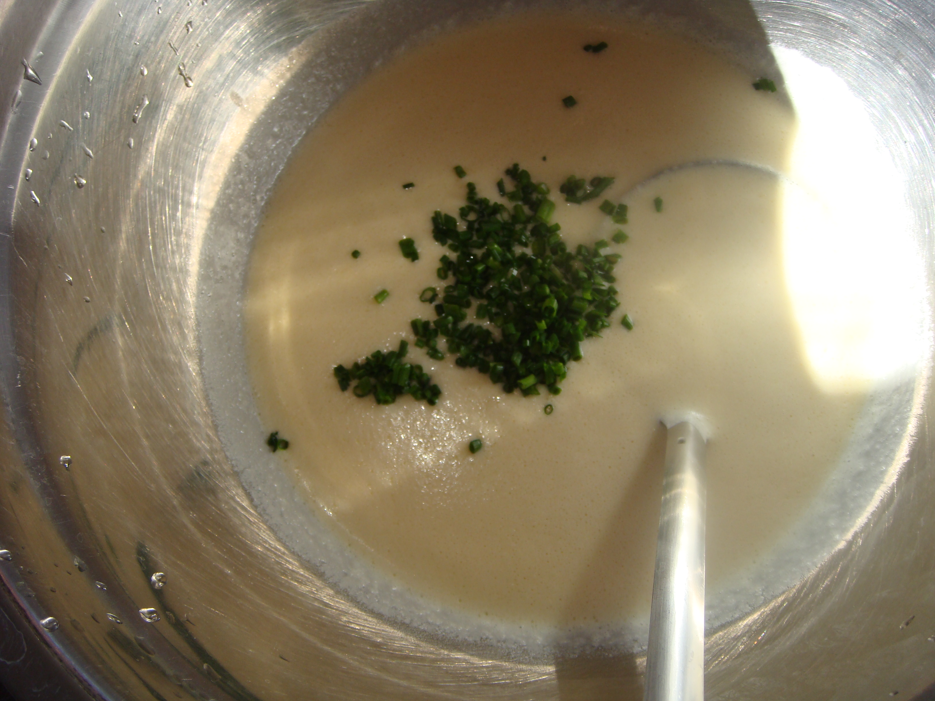 4可麗餅制作: 先攪拌 面粉,鹽,雞蛋,牛油,牛奶. 用過濾網過濾渣,之後加入小香蔥攪拌成糊狀。