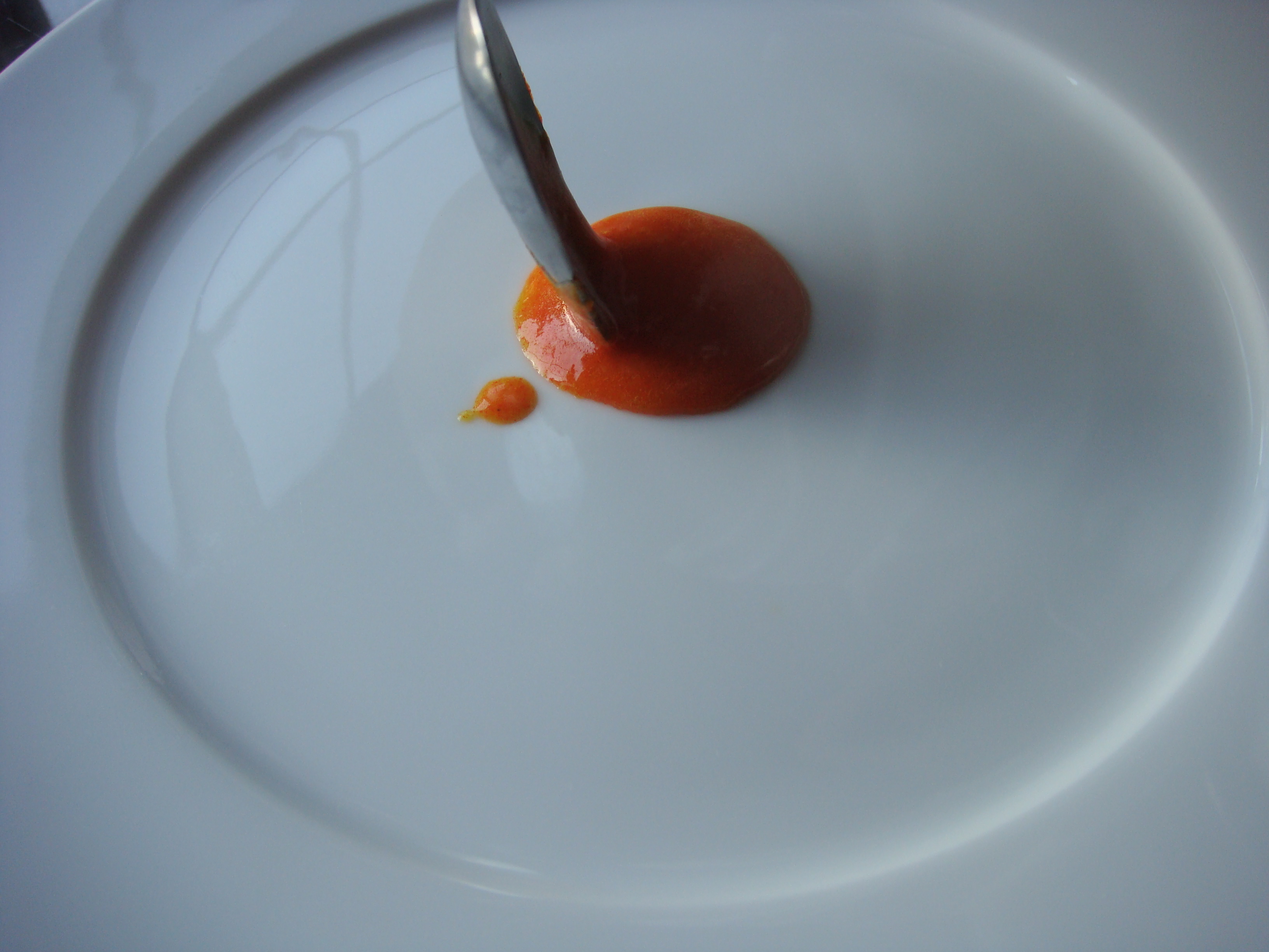 10裝盤:將一勺的姜和紅蘿卜乳放在中央,在乳汁的基礎上用勺子背面稍微360度旋轉擴大。