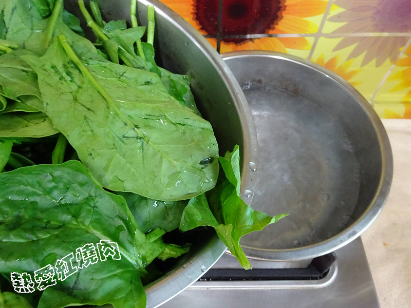 2首先將洗干淨的菠菜葉用開水焯燙一下然後過冷水