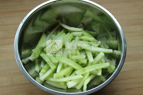 2西瓜皮去皮洗淨切條,西瓜皮放入盆中放少許鹽腌制片刻