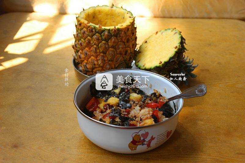 健康養顏菠蘿飯,紅新鮮的菠蘿、聖女果,加上枸杞、紅棗,干果葡萄干,用紅糖、海苔調味,做出一道美味的菠蘿飯。”