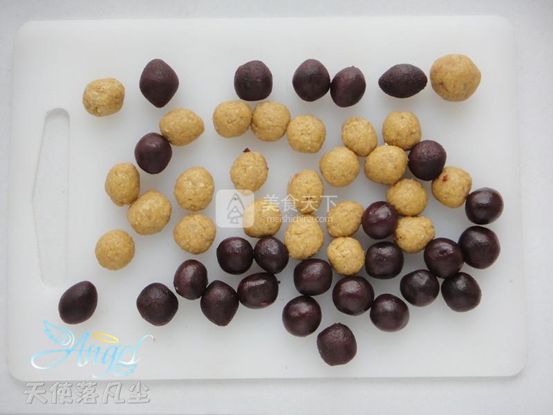 5按照一樣的重量將小麥胚芽面團和豆沙餡都分開團成球,我的一個10克。