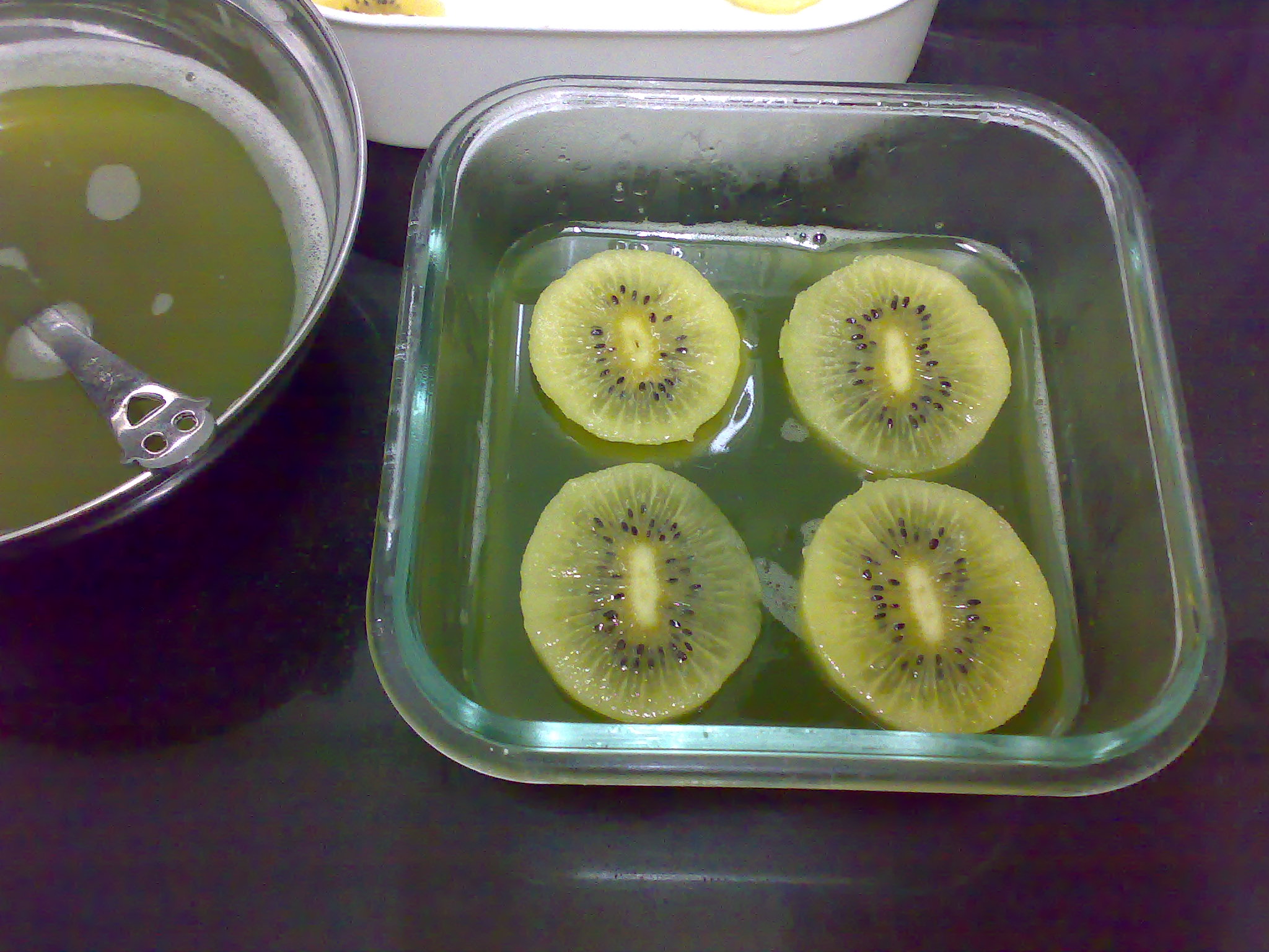 9把果凍修切成猕猴桃大小,再放一片猕猴桃在上面即可食用
