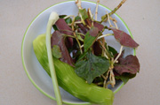 2將魚腥草折成小段,筍刨成絲,小蔥切碎,加鹽和糖。