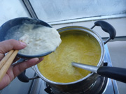 1313、將炒好的南瓜換至湯鍋,加豆漿。