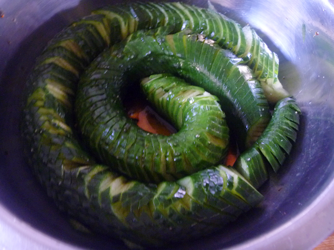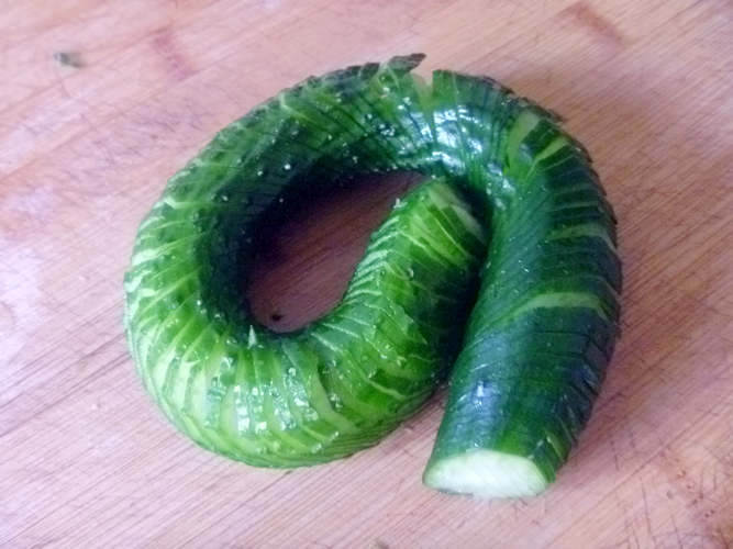 4在切成連刀片,切完就可以看到很柔性的蓑衣黃瓜了。