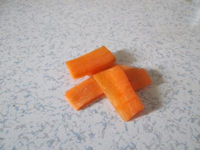 6下入莴筍 胡蘿卜片和桃仁焯水。