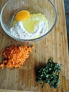 3薄荷葉和胡蘿卜切碎,面粉打入雞蛋。