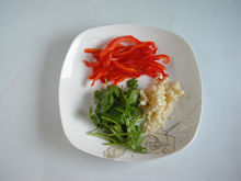 4取少許紅椒切成絲,香菜切段,蒜瓣切成末,備用。