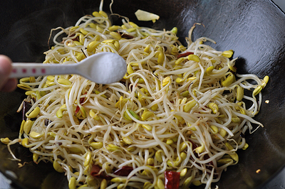 1、干煸豆芽香辣,口感有韌勁。2、因綠豆芽水分過大,不易於煸炒不推薦干煸綠豆芽。 使用的廚具:炒鍋