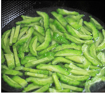 1將苦瓜洗淨去瓜蒂、去瓤、切成條備用