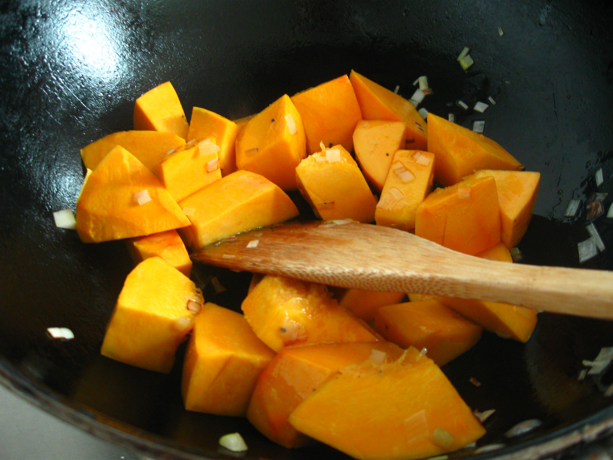 3炒鍋放油,用蔥花兒爆香,下入南瓜塊兒翻炒