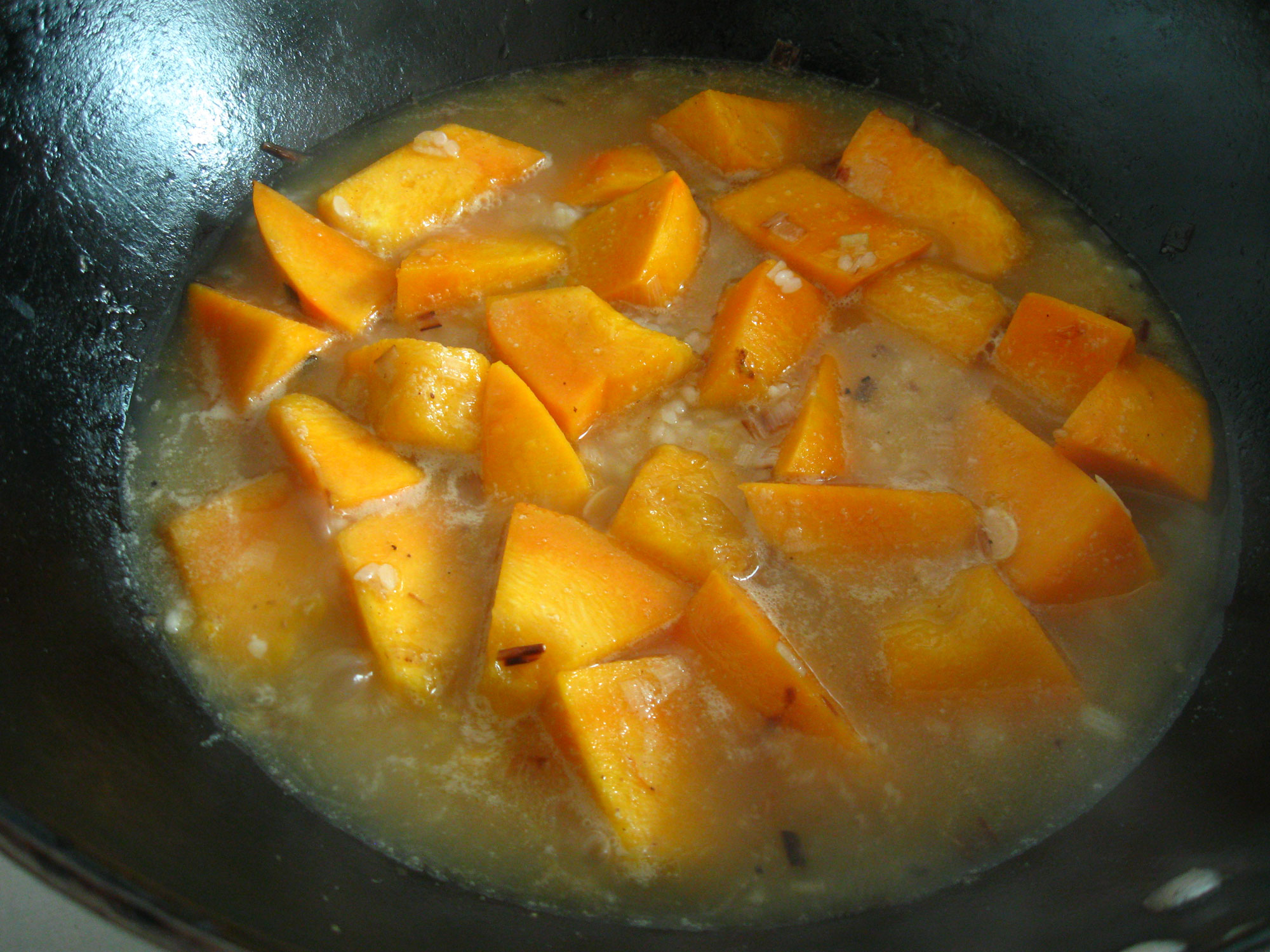 4加入適量雞精、花椒面和一點點鹽翻炒後,加入適量水(冷水熱水都行),水面與南瓜持平