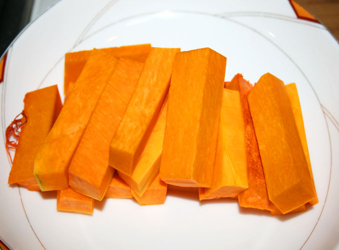 2南瓜去皮切好切成長6厘米,寬3厘米的長方條。