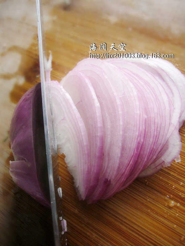 “東北人非常喜歡涼拌菜,炎熱的夏天就更喜歡做涼拌了。涼拌菜食材基本都是生的,所以最好的保留了蔬菜的營養與口感。看外國人基本都吃洋蔥,炒菜爆香也是洋蔥,而我們基本用的是大蔥、小香蔥爆香。洋蔥也叫圓蔥營養價值極高,洋蔥中含有蒜素與及硫化硒,能夠抑制癌症物質的合成,增強細胞活力,對高血壓、高血指、心腦血管病人會有保健作用。洋蔥有白皮、黃皮、紫皮三種,今天介紹這道《涼拌雪梨洋蔥》我用的是紫皮,紫皮洋蔥這三種營養最高的。而且我去超市看到紫色就買了紫色,涼拌最好用白色的比較不辣微甜。大家在做這道菜之前要將洋蔥切兩瓣放入冰箱冷藏室半小時,這樣減少洋蔥的辣味切時就決不會辣眼睛。”