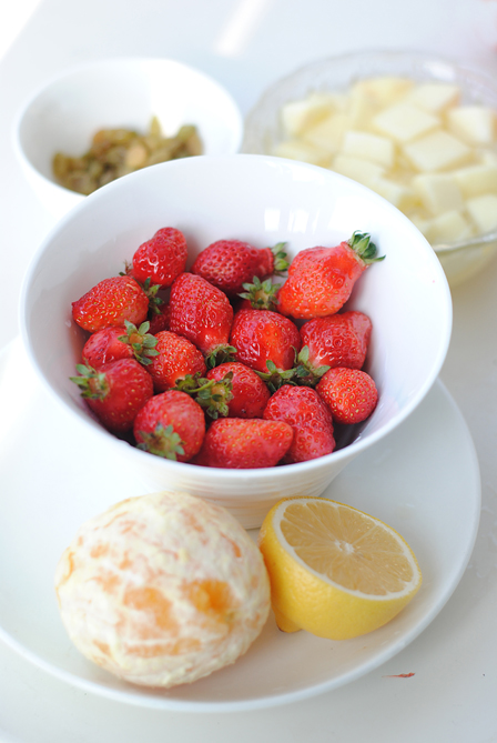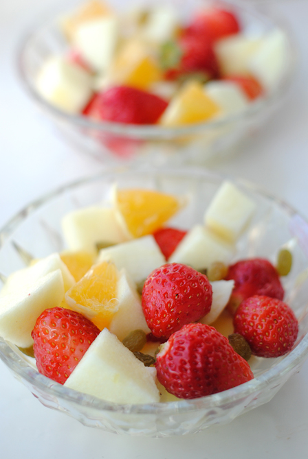 4橙子切削塊,與草莓、蘋果、葡萄干混合。