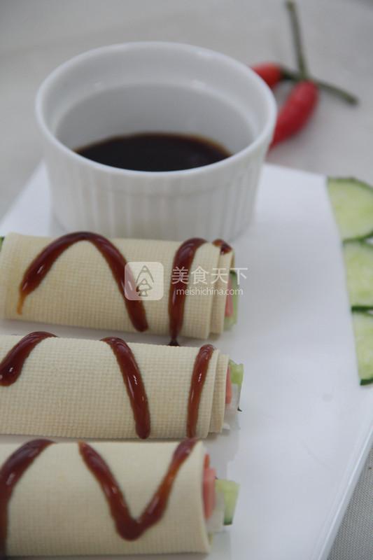 5取一張千張皮,上面擺好材料,然後再將其卷起來卷成卷