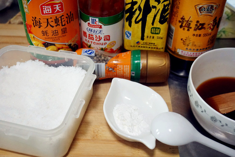 5用備好輔料(料酒、糖、醋、番茄醬、蚝油)做出一碗調味料,同時准備些水澱粉備用。