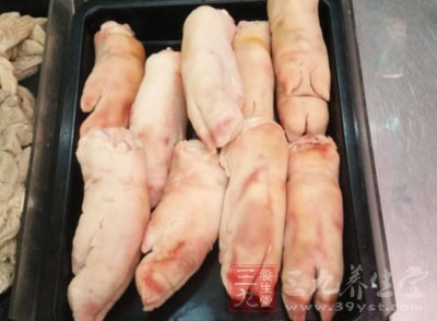 豬蹄中含有豐富的膠原蛋白質,脂肪含量也比肥肉低,近年在對老年人衰老原因的研究中發現,人體中膠原蛋白質缺乏,是人衰老的一個重要因素。它能防治皮膚干癟起皺、增強皮膚彈性和韌性,對延緩衰老和促進兒童生長發育都具有物殊意義。為此,人們把豬蹄稱為“美容食品”和“類似於熊掌的美味佳肴”。