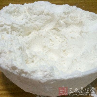 3、將放有蛋黃的碗裡加兩勺白糖,加三勺冒尖的面粉,