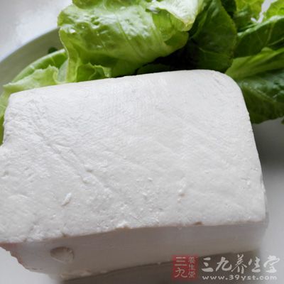 1.豆腐去硬邊切成厚片,用少許料酒和鹽腌制片刻。