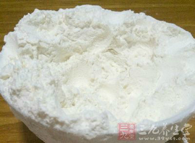 1、盆裡放入中粉,酵母用溫水化開加入面粉中。