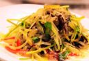 5、放上紅椒絲和蔥絲,淋上調好的汁攪拌均勻即可。