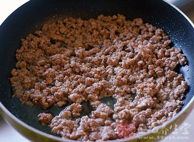 6.炸花生剩下的油燒熱下入肉末煸炒變色。