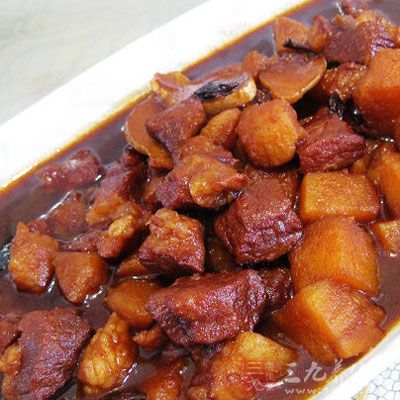 ⒊ 豬肉屬酸性食物,為保持膳食平衡,烹調時宜適量搭配些豆類和蔬菜等鹼性食物,如土豆、蘿卜、海帶、大白菜、芋頭、藕、木耳、豆腐等。
