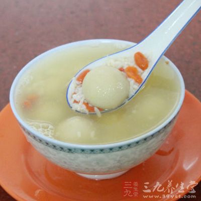 材料:西米、糯米粉、雞蛋1只、枸杞籽幾粒、冰糖適量。