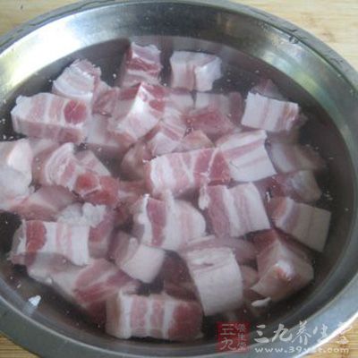 2.盆中裝入涼水,加入一大勺料酒,放入五花肉塊,浸15分鐘。