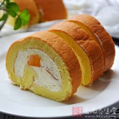 3、餅待涼鋪平,裹入奶油和芒果條卷好,切開。淋巧克力煉乳即可。