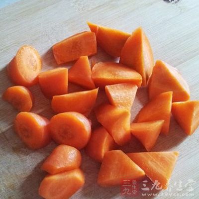 2、將洗好的胡蘿卜切滾刀狀。