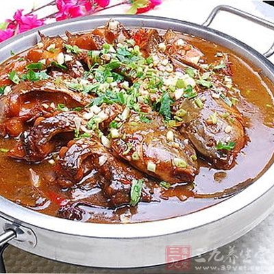 13、湯汁焖到差不多干的時候灑上蔥段、芹菜段關火。
