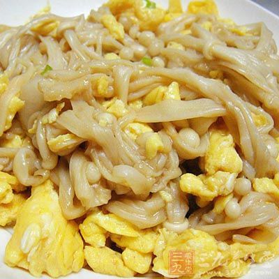 4、鍋中放少許油燒熱,下金針菇,炒至發軟,加入炒熟的雞蛋。